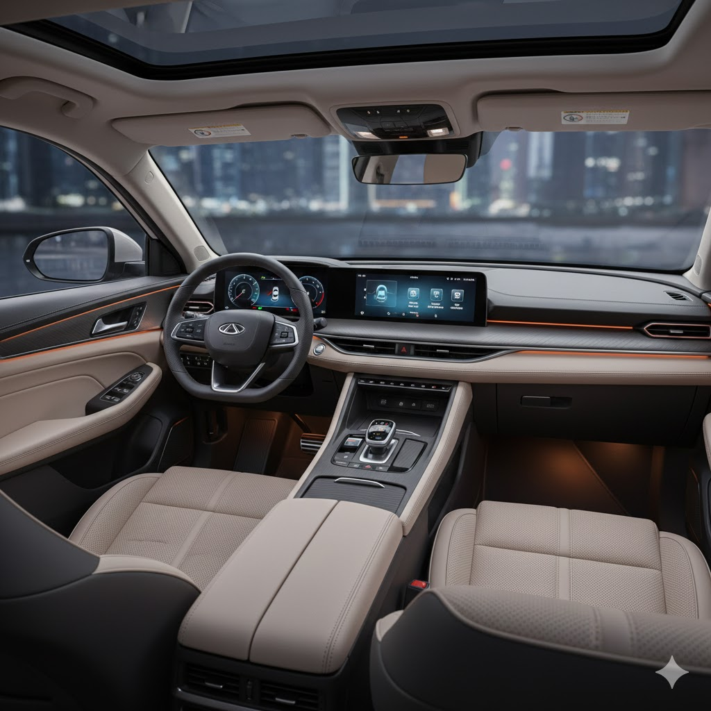 Bagian interior Jaecoo J5 dirancang untuk memberikan kenyamanan dan kemewahan. Kabinnya menawarkan tata ruang lapang dengan material soft-touch yang memberi kesan upscale. Dashboard minimalis dengan layar besar menjadi pusat perhatian, dan pencahayaan ambient memberikan suasana yang elegan. Kursi ergonomis dirancang untuk menemani perjalanan jauh dengan nyaman. Interior ini mencerminkan karakter SUV modern yang memprioritaskan kenyamanan pengguna.